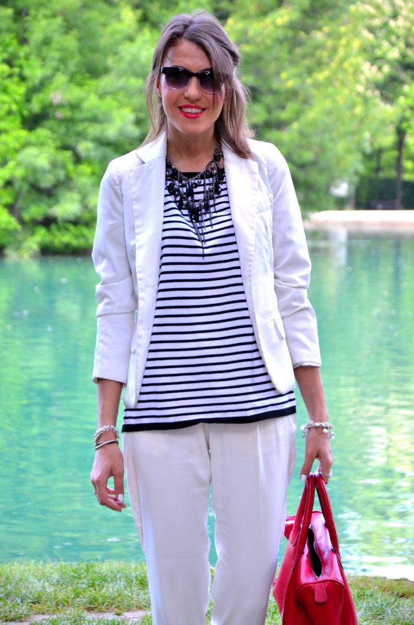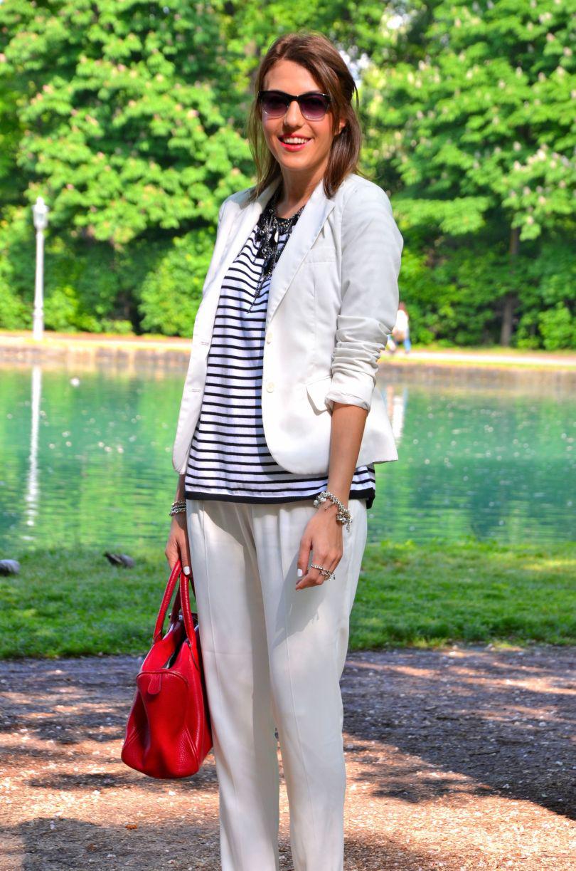 [RO] Am folosit in postarea de astazi 3 elemente chei a acestei veri: culoarea alba,dungile si espadrilile. Pantalonii sunt de la asos si ii ador. Au un tesut atat de usor,perfect pentru zilele calde. In sfarsit azi am avut si noi parte de soare. Vreau sa savurez de el din plin,vazand ca in acest weekend va ploua din nou. Bluza este de la ZARA . Daca nu ati achizitionat inca nici un articol in dungi,data viitoare cand mergeti la shopping procurati-va ceva in acest print. Atentie insa care dungi alegeti: orizontale sau verticale. Acelea orizontale maresc si adauga volum,verticale alungesc si slabesc foarte mult. Al 3 element a acestei veri sunt espadrilele. Aahhh,eu visam la acelea de Chanel ,insa pentru moment ma multumesc cu astea din magazinul unde lucrez eu, Subdued .Mie imi plac enorm, voua?