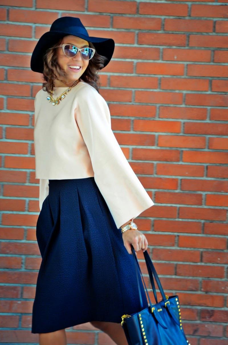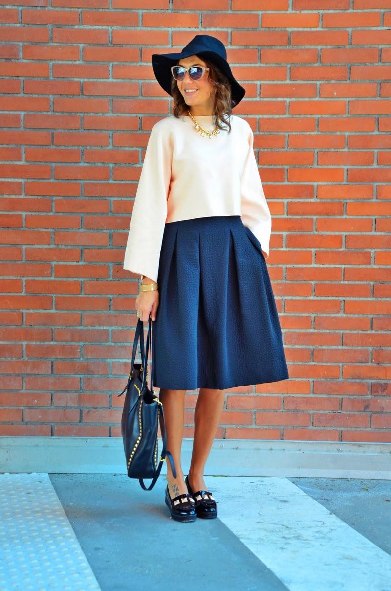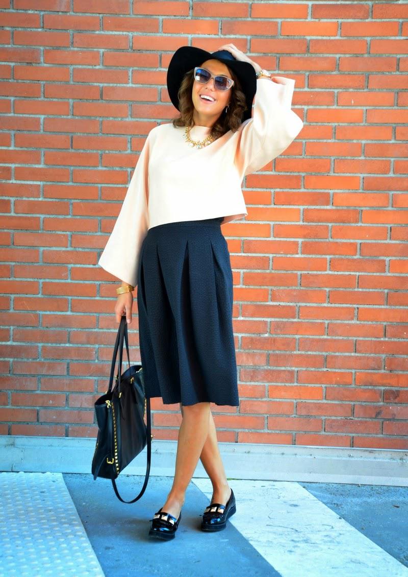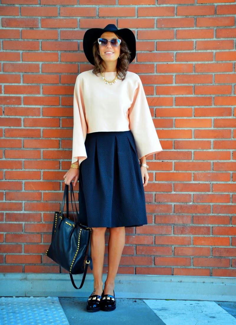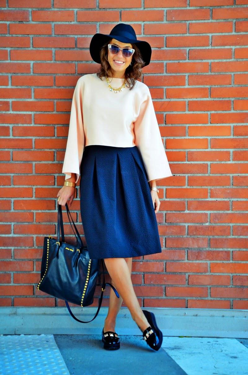 : Zara top, H&M skirt, hat and loafers, Guess watch, Miu Miu bag