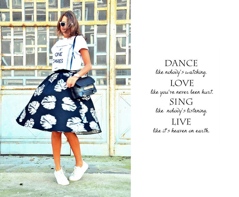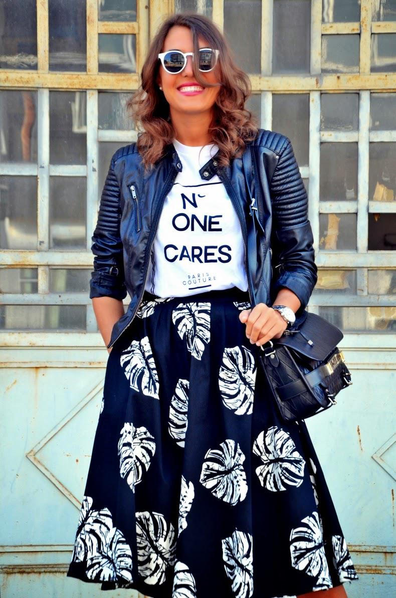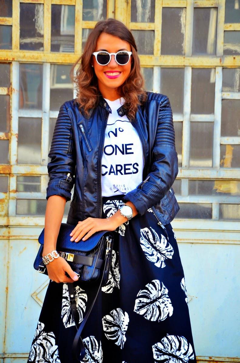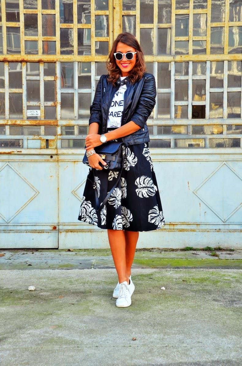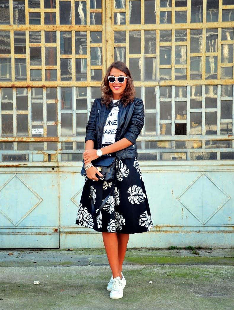 [IT] Sono una fan delle gonne midi. Ho l'armadio pieno e non mi bastano mai :)). Proprio questa settimana ho scelto altre 2 gonne nuove e non vedo l'ora che arrivino. Ho visto varie foto della settimana della moda , nelle quali questo genere di gonna viene abbinato a delle scarpe da ginnastica e maglie con scritte. Mi sono ispirata a questi outfits, per creare il mio look di oggi. Tale maglia puo' essere portata con un paio di jeans, pantaloni di pelle o pantaloni bianchi e un blazer nero. Con un paio di shorts, una gonna midi o mini... Le scritte le scegliete voi ;). A me e' piaciuta molto questa ''N° one cares'', ma nei negozi ne trovate a centinaia con scritte stupende ;).