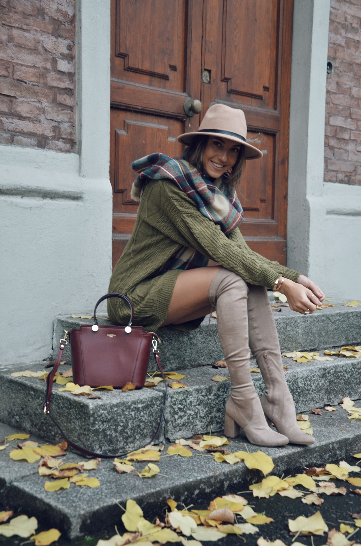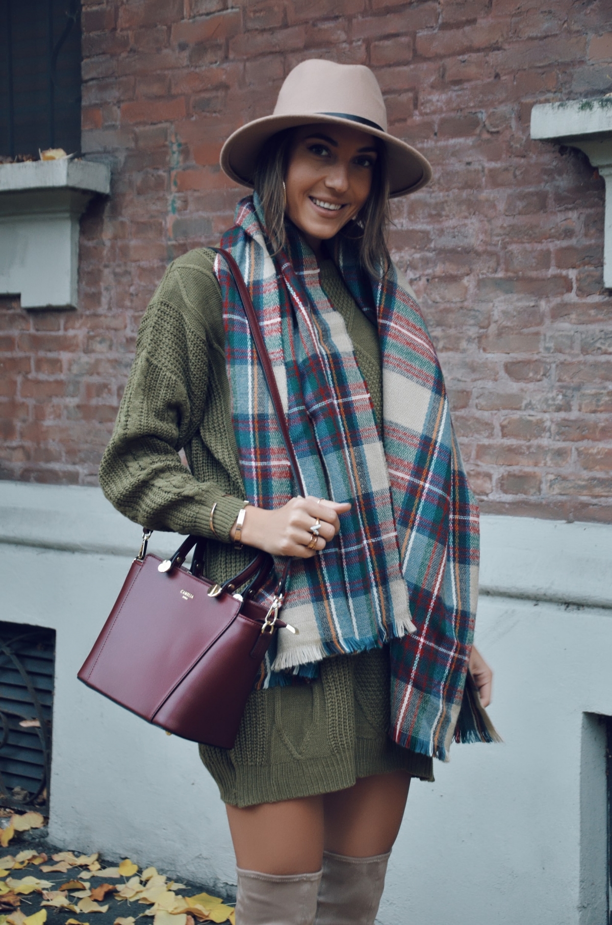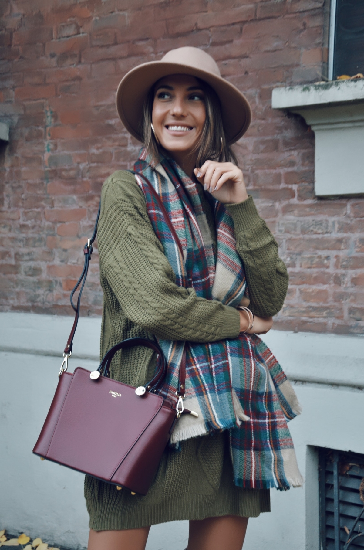 Non so voi, ma io adoro questi mega maglioni che si possono indossare come dei vestiti. Mi piace tantissimo anche questo colore verde oliva...quindi non potevo trovare di meglio: modello e colore preferito. Ho indossato questo vestito-maglione con un paio di stivali alti beige, sciarpa e fedora. Ho abbinato il colore verde oliva con la mia nuova borsa color vinaccia di CAMELIA ROMA. Penso che verde stia molto bene con il bordeaux. Il vestito invece l'ho preso QUI. Non e' molto pesante, pero' per il prezzo che ha si puo' fare ;).